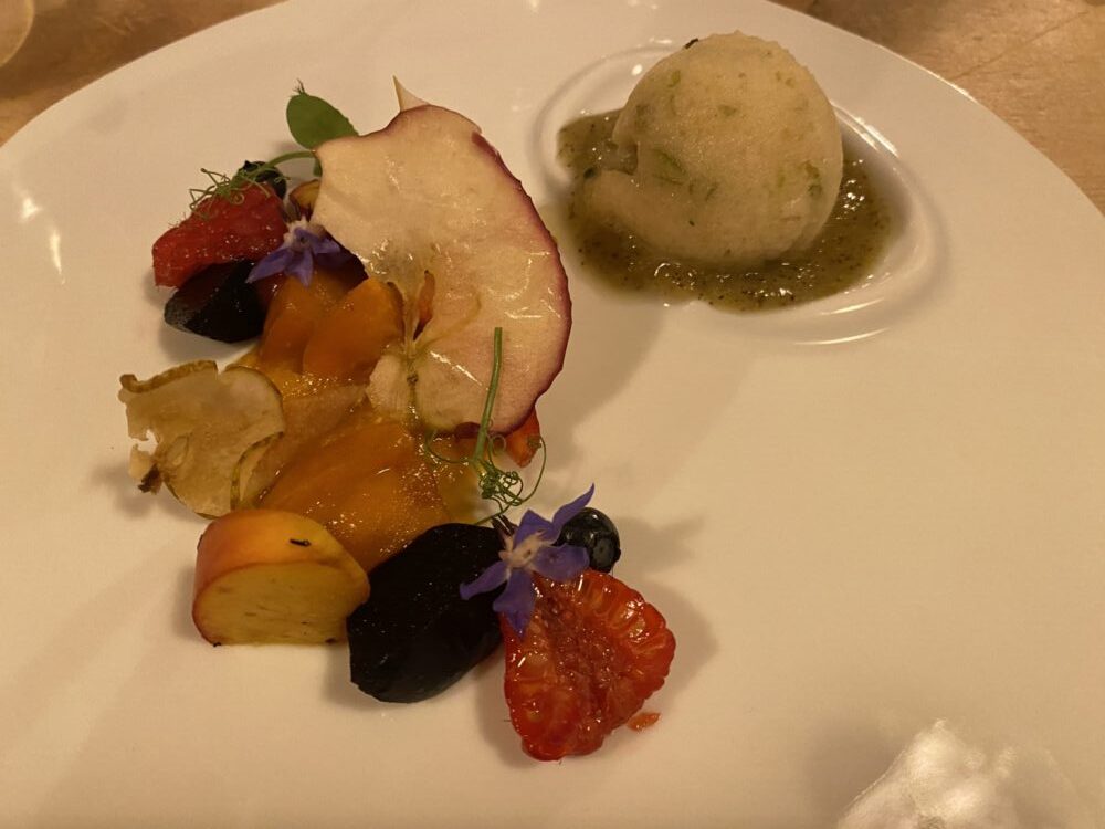Fugnanesi nell’allestire il menu si è ispirato all’innegabile bravura di Pietro Lehmann, nella consapevolezza dei limiti del territorio. Livigno si trova a 1800 metri, altitudine che non permette grandi coltivazioni. E’ terra di tuberi, radici, erbe spontanee, verze. Vegetali che debbono per forza essere integrati con prodotti coltivati altrove, perché è fuori discussione che il tocco mediterraneo sia sempre quello più seducente.