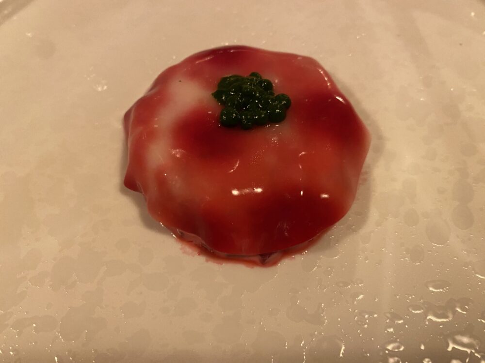 Così, “Verticalità Vegetale” è una torre di sedano rapa, patata, ravanelli, zucchine e maionesi alla curcuma, al pomodoro, al carbone vegetale. Un piatto senz’altro migliorabile, mantenendo la base acetica del ravanello. Sono più intriganti gli omaggi alla cucina mediterranea rivisti in chiave local.