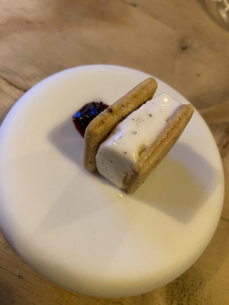 Stua da Legn – amouse boiuche – cracker, gelato al formaggio, pesteda e ciliegie