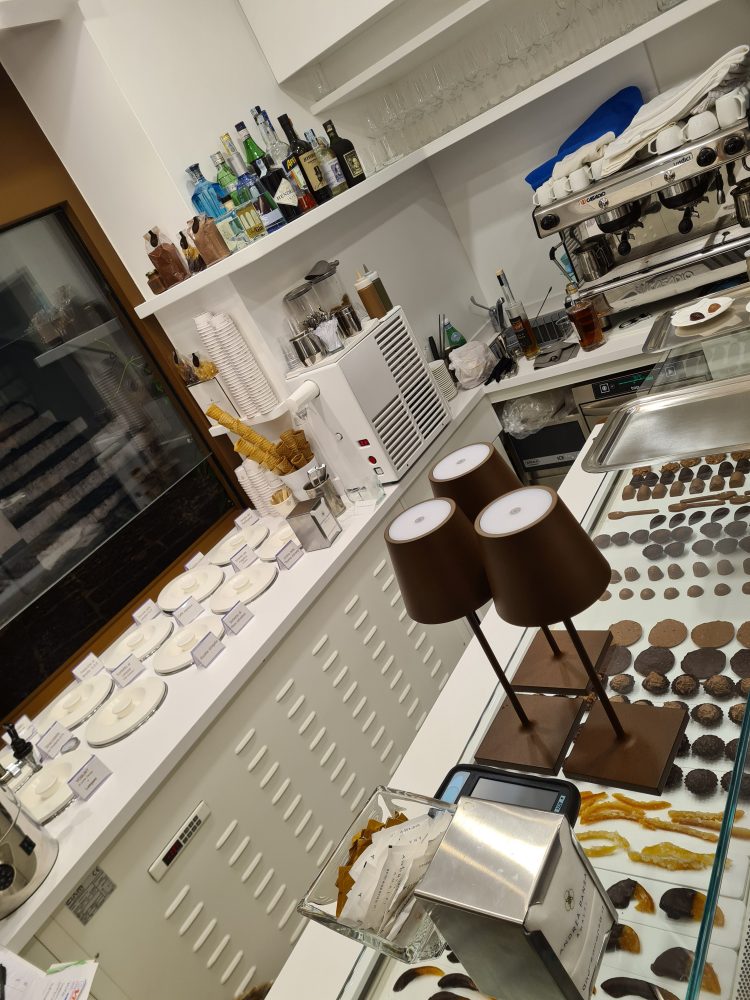 Qui come gioielli, dominano la vetrina cioccolati e gelati, messi in bella mostra, proposti con stile e accompagnati da musica jazz, questa elemento portante del nuovo format con il volume sempre ben alzato che lascia ascoltare le migliori selezioni musicali.