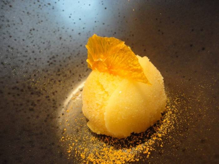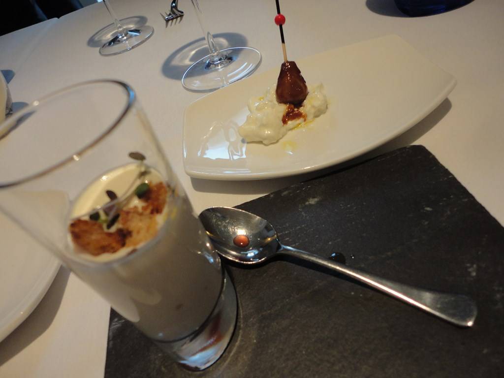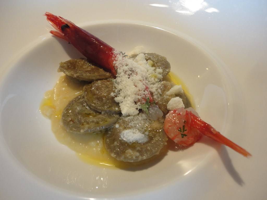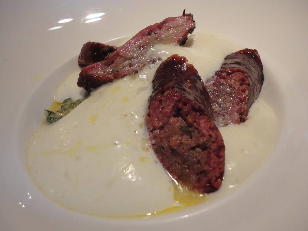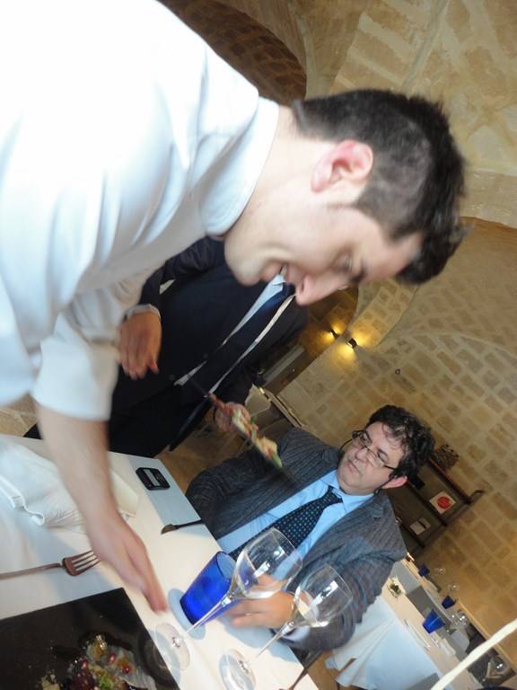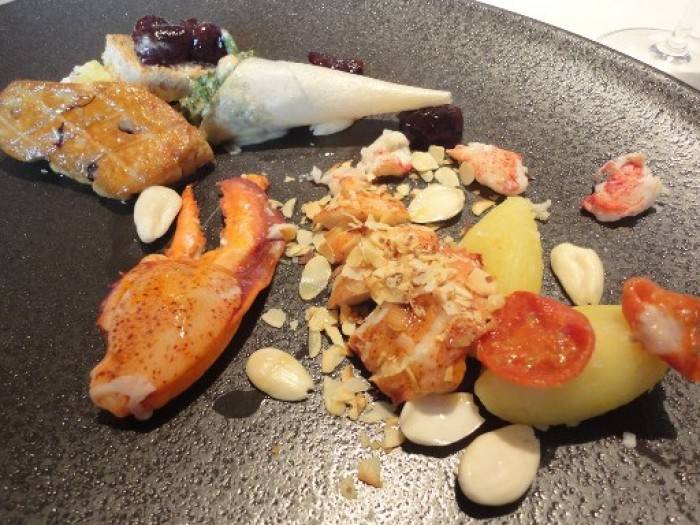 E qui si è toccata con mano, plasticamente, l’influenza “Marchesiana”, peraltro già presente negli altri piatti, di associare elementi di gusto non troppo contrastanti e rimandare così l’equilibrio all’abbinamento del vino. Potremmo benissimo chiuderla qui, ma la curiosità ci porta ad andare …ai secondi. Astice e foie gras con mandorle di Toritto e ciligie Ferrovia per me, ottima materia prima, perfetta l’esecuzione, ma…magari se ci fosse stata un pò di spinta in più, alla già presente acidità delle ciliegie…sarei volato in cielo!!!