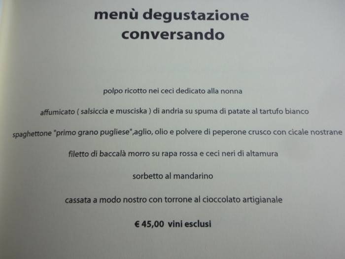 Risolto il problema, con il Pigna che brontola ancora per la perdita di diecimila e passa contatti, ci abbandoniamo ad un delizioso benvenuto di bollicine D’Araprì Pas dosè, metodo classico a base di Bombino Bianco con una percentuale variabile, anno per anno, di Pinot Noir.
