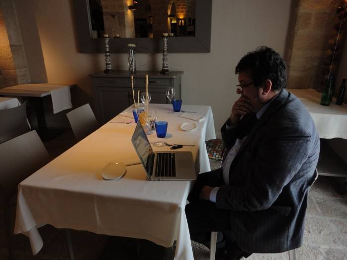 Con Nicola Campanile, il re di Radici Wines, non si scherza … ogni incontro si fa a tavola…e che tavole!!! Con l’automobile carica di bombole d’ossigeno irpino (la cosa si prevede lunga, addirittura pernottamento ne “Le Puglie”, come dice Giuseppe Barretta) facciamo tappa ad Andria, dove ci dovrebbe attendere (ma quando mai, arriva dopo quasi mezz’ora…come al solito) Nicola. Intanto, insieme al Pigna, prendo posizione al tavolo più defilato del ristorante “Umami”, che bisogna ottimizzare smanettando sul pc per risolvere il momentaneo problema di black out del sito. Il Wi-fi più veloce della luce, ci porta a considerare un bonus iniziale di almeno dieci punti.