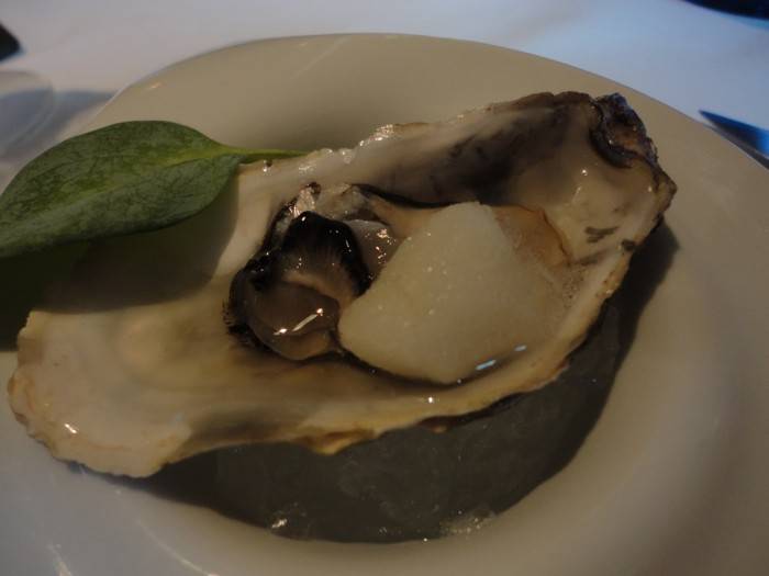 Per antipasto prendo il Carpaccio di sarago con salsa ai fichi d’India e ostrica con granita alla menta. La particolarità di questo piatto è la foglia d’ostrica (Mertersia Maritima) che viene servita insieme al mollusco bivalve e che rozzamente avevo scambiato per decorazione (le ostriche del nostro LAGO LACENO in Irpinia non si accompagnanocon le foglie ;-)) ed invece era da mangiare visto il sapore iodato che emana.