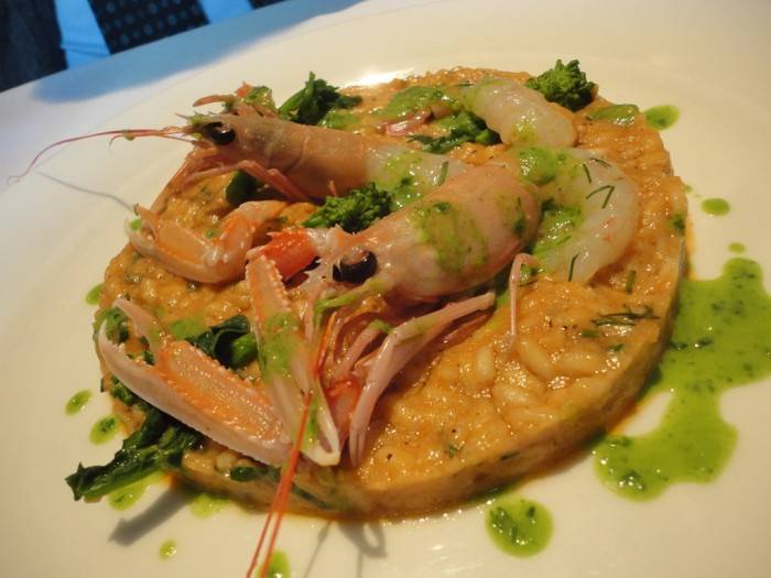 E andiamo ai primi…Riso carnaroli con assoluto di scampi e cime di rapa per Luciano, e Spaghettone “primo grano pugliese”, aglio, olio e polvere di peperone crusco con cicale nostrane per me e per Nicola(solo un assaggio).