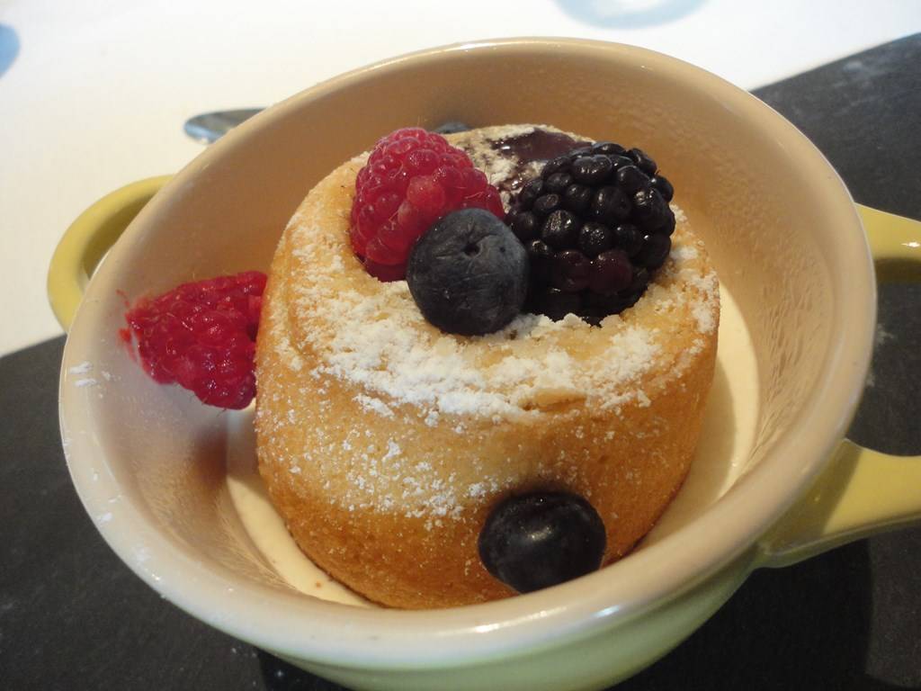 Tortino al cioccolato bianco con cuore cremoso al cocco per “penna veloce”, Sfoglie di cioccolato(70%), frutti di bosco e mousse al pistacchio per il Campanile.