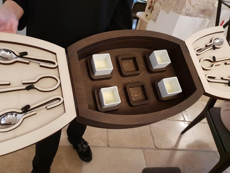 Per raccontare il pranzo da Angelo Sabatelli, parto dalle conclusioni finali. Ci troviamo, per me, nel miglior ristorante di Puglia e tra i migliori del ristoranti Sud Italia. I motivi sono diversi. Sicuramente la location, il bel palazzo gentilizio nel centro di Putignano, arredato con gusto e garbo. Il servizio in sala di livello, curato dalla signora Laura, la carta dei vini, intelligente e con dei ricarichi più che corretti orchestrata da Giovanni Tortora, con una selezione invidiabile di champagne. Questa è la cornice alla cucina di Angelo, che rappresenta in pieno la moderna cucina Mediterranea del Sud Italia. Intuizioni brillanti, tanti spunti tecnici, frutto di tante esperienze, ma con i piedi ben piantati nella propria terra e nelle proprie tradizioni.