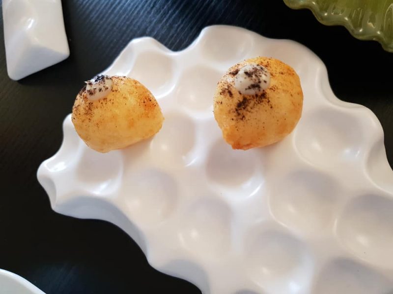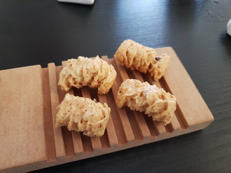 Tanto divertimento per gli aperitivi iniziali, in due servizi, su tutti la pelle di rombo soffiata, salsa miele e senape, misticanza.