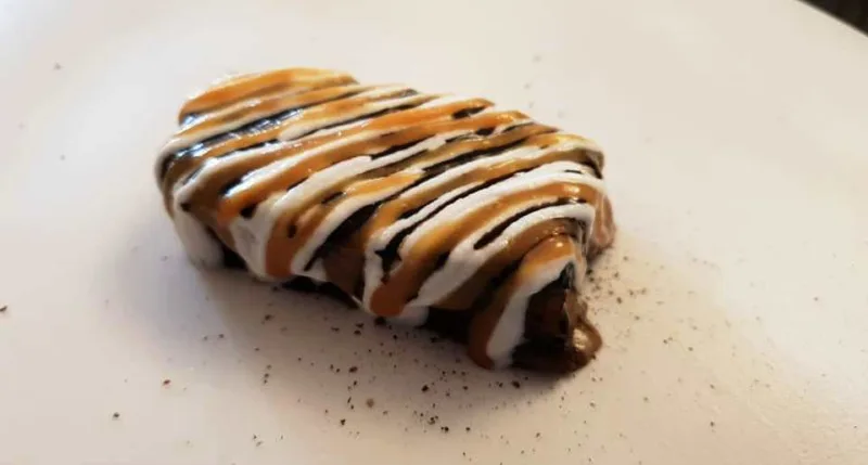 Anche in questo piatto la salsa in accompagnamento è veramente buona, precisa la cottura del pesce, la panatura di olive ha il ruolo un esaltatore di gusto.
