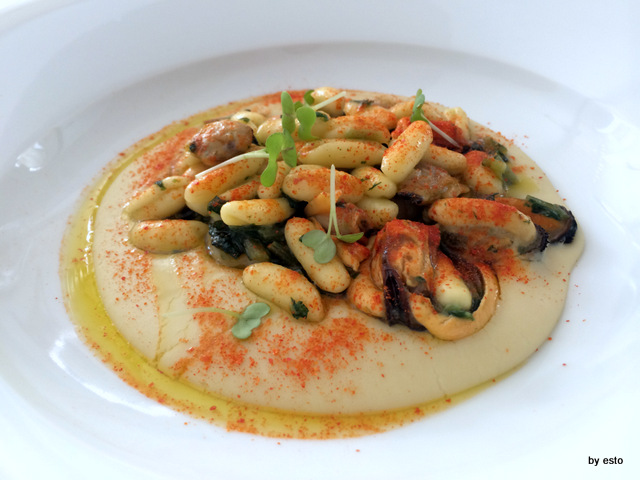 Masseria Spina. Angelo Sabatelli Cavatelli con frutti di mare e cicoria appena piccante su crema di fave