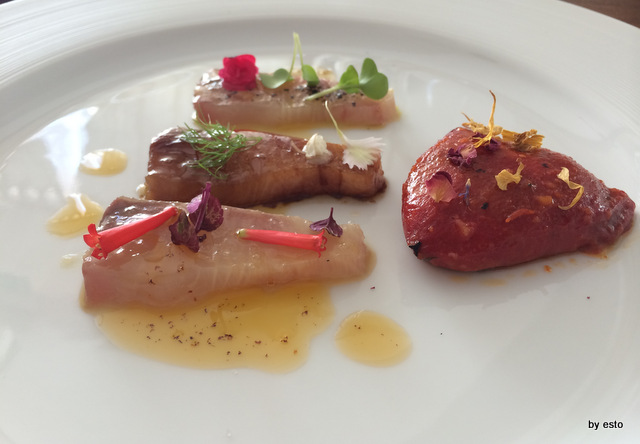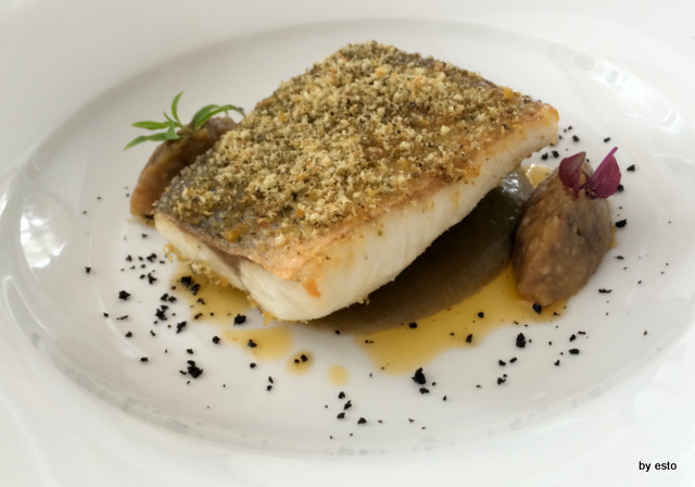 Masseria Spina. Angelo Sabatelli Spigola con salsa di olive alla calce, pomodorini canditi e pane aromatico