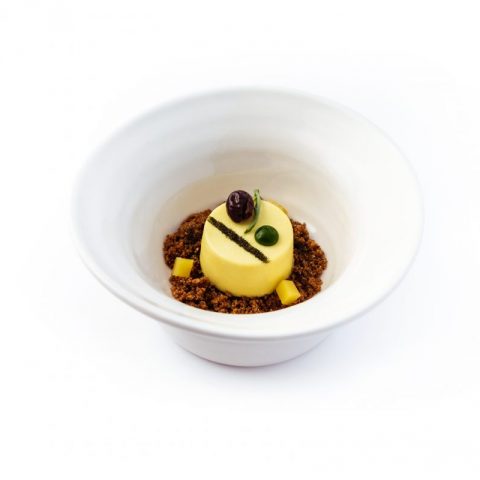 Sistemare alla base del piatto il crumble, aggiungendo la polvere di cicoria e di noccioli di olive nere di Gaeta. Adagiarvi al di sopra la bavarese ed ultimare con una nuova aggiunta di polvere di cicoria, di noccioli di olive nere di Gaeta, un cubetto di gommosa, una foglia di rucola di mare candita, la goccia di gel di rucola selvatica e l’oliva di Gaeta candita. Finire al tavolo il servizio del dolce con un filo di olio all’arancia.