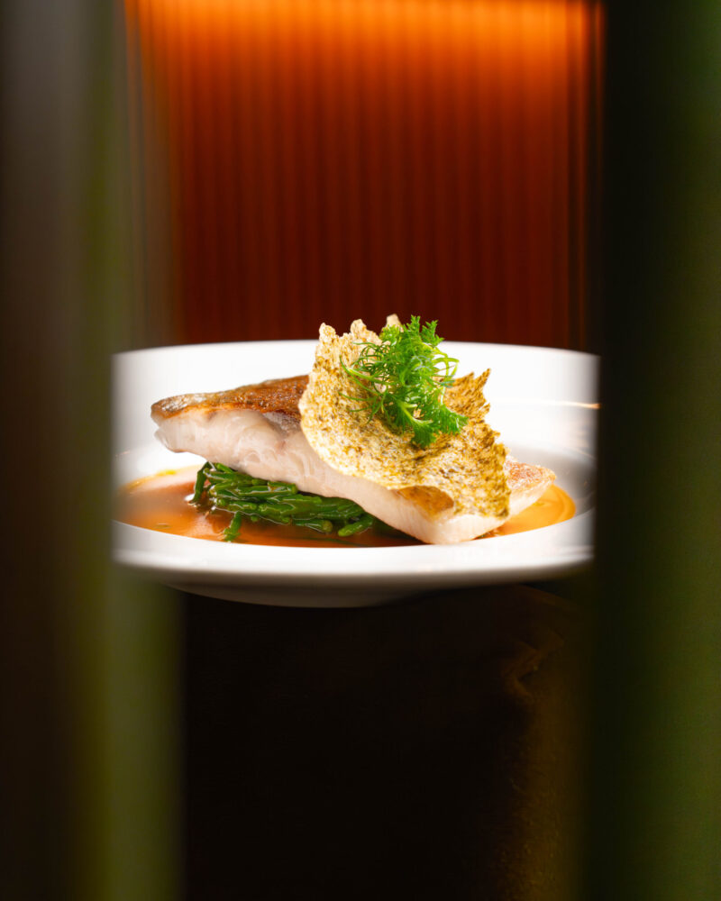 La Ricciola, bouillabaisse, salicornia, chips di alga nori è invece tutta giocata sul mare. La bouillabaisse amplifica il carattere iodato del pesce, mentre salicornia e alga nori aggiungono tensione e una sfumatura quasi orientale. Pulito, coerente, senza sbavature.