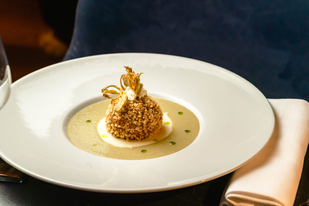 La Sfera di carciofo, fonduta al parmigiano, olio alla mentuccia, carciofi croccanti lavora invece su un registro più identitario. Qui Roma è chiaramente evocata, ma riletta con eleganza: la fonduta di parmigiano avvolge, la mentuccia alleggerisce, il croccante dà ritmo. Un piatto che gioca sulle consistenze senza perdere riconoscibilità.