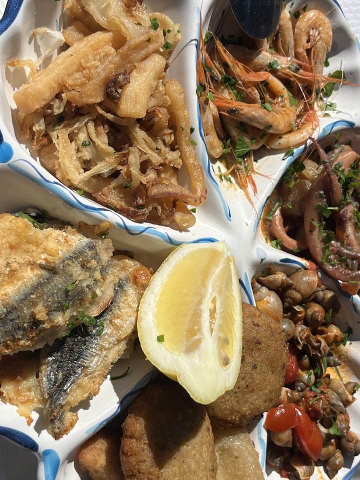 Detto fatto, direzione Marina di Vietri sul Mare. Ho frequentato molto questo posto da ragazzo, ora mancavo da un po’. Mentre camminiamo baciati dal sole, mi sento chiamare, mi giro e vedo Cosmo di Mauro, titolare del ristorante Antica Bagnara. Fermarsi ai tavoli esterni per un aperitivo e due chiacchiere è d’obbligo, e non mi meraviglio se le chiacchiere diventano pranzo.