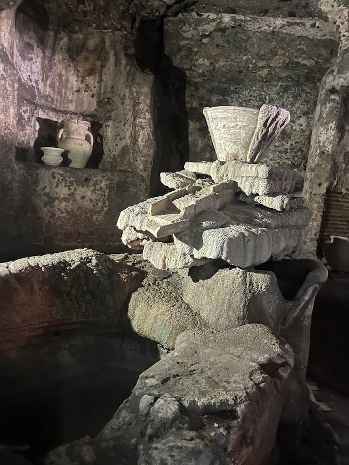 Troppo sazi per il dolce, un goccio di limoncello e ci concediamo dagli amici per fare altri due passi, ma prima è d’obbligo una visita al calidarium di epoca romana che fa bella mostra di sé all’interno del ristorante. Veramente sorprendente.