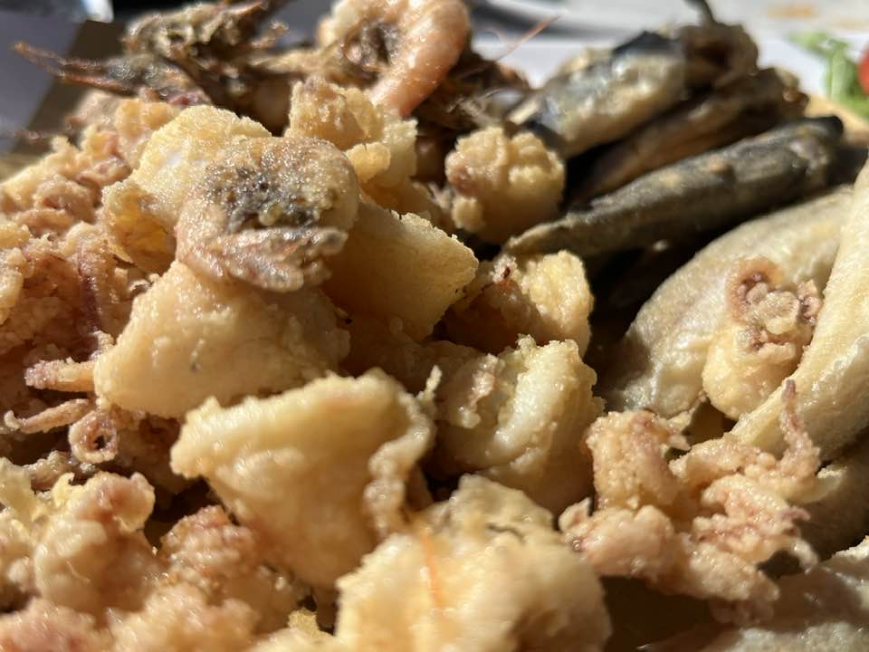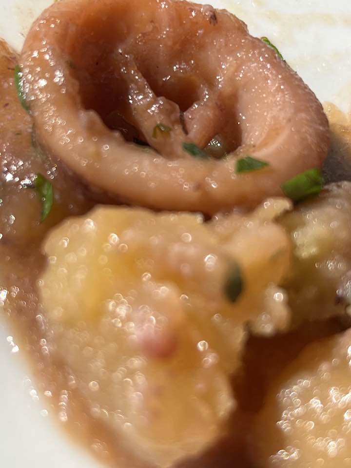 Un calice di prosecco serio fa da apripista ad una serie di assaggi, di mare: ottima focaccia con burro e alici (un must), saporite alici imbottite, gustose polpette di mare (anche se un tantino gommose), sfiziosi gamberetti, da mangiare con le mani, totani e cipolle (la mia metà apprezza, io non mangio cipolla), fantastici totani e patate (ne avrei mangiato una vagonata) e buonissimi maruzzielli che non mangiavo da quando li preparava la mia mamma a cui piacciono moltissimo.