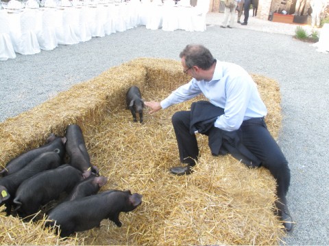 Poi, il meraviglioso taglio di un parmigiano reggiano di VENTI ANNI , che in alcuni punti ha mantenuto pressoché intatte le proprie caratteristiche ed in altri direi che ha virato verso profumi e perfino sapori castelmagneschi. Poi tutti seduti nella meravigliose corte , dove la centralità era costituita dai maialini neri con i quali Bottura ha cercato un contatto. Quelli si ritraevano , probabilmente già consci che lo c hef modenese in contemporanea li pensava già in qualche ricetta.