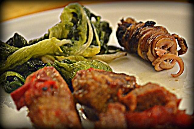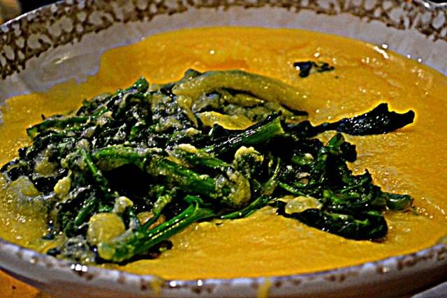 E’ l’ora del pezzo forte: l’abbuoto, interiora di agnello sapientemente preparati e rosolati in padella, un’estasi per gli amanti delle interiora, con in aggiunta dei morbidissimi bocconcini di maiale in agro con papaccelle di orto e scarola liscia, si stappa il Bosco Caldaia 2007, molto più fuso in tutte le sue parti ma per me meno appagante della Barbetta, perchè meno profondo e persistente, ma godurioso vino quotidiano.