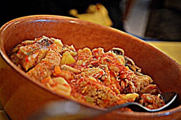 Il salato non può giungere al termine senza dei piccoli piatti di coccio con della trippa in umido fumante, delicatissima quanto appagante al quale diventa d’obbligo lo stappo dell’Aglianico Marraioli 2008, un sorso nella sua massima espressività territoriale, un Aglianico puro, duro ma privo di ostentazione alcuna.