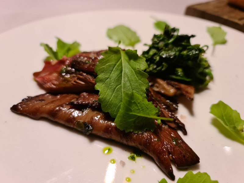 Pleurotus alla rapa rossa, arrostito con aglio e olio, friarielli, sale maldon. I funghi prendono la consistenza della carne. La marinatura nella rapa rossa aggiunge un tocco inaspettato e assolutamente piacevole. Il passaggio in aglio e olio allunga la parte gusto olfattiva. I friarielli con la loro parte amarognola fanno il resto. Non è facile per quanta riguarda i secondi stare lontani da carne e da pesce, ma in questo caso non si sente la mancanza.