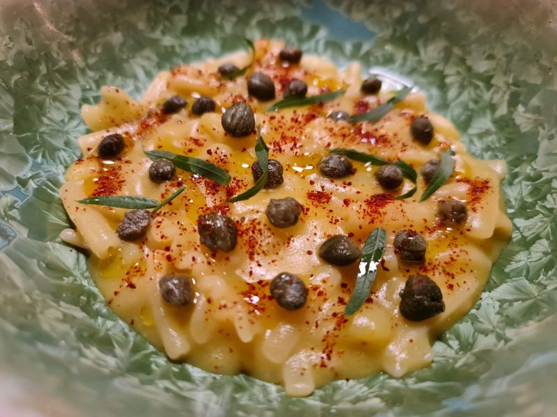 Pasta e patate, capperi all’aceto, foglie di schinus e polvere di peperone crusco. Quando tocchi la tradizione, la pasta e patate è quasi una religione e provi a cambiare i fattori è sempre complicato. Una pasta e patate che gioca sui cambi di ritmo di acidità e sapidità, ed ovviamente sulla leggerezza rispetto alla versione tradizionale. E’ la prima volta che mi capita di provarla così. Acidità e sapidità che la rendono moderna, buona, di una golosità diversa rispetto all’originale. L’ho divorata, perchè oltre alla bontà, l’ho trovato davvero uno di quei pensieri intelligenti.