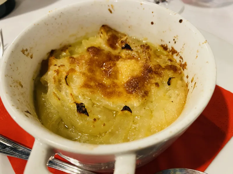 Così, non mancherà mai l’aringa in bellavista con composta di cipolle rosse e il suo omologo, il “fuà gra’” locale, patè di fegati morbido con pane alle uvette; la zuppa di cipolle all’erborinato perché “la Francia ce l’abbiamo noi”; il baccalà; le lumache al verde e polenta rustica, e quando ci sono le imperdibili trotine fritte del Brenta, non sempre disponibili per via di pezzatura.