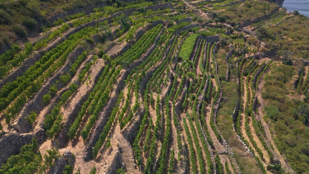 Emanuele realizza dal primo momento che fare vino a Ponza è durissimo. La coppia non si è mai arresa, da oltre vent’anni, compagni di vita e d’avventura, allevano e vinificano questi vitigni autoctoni, in una terra aspra, che non fa sconti. Qui tutto è difficile: il lavoro è completamente manuale, inerpicandosi a piedi, o con l’aiuto dei fedeli asini, sugli stretti terrazzamenti, modellati dai muretti a secco, faticosamente costruiti.