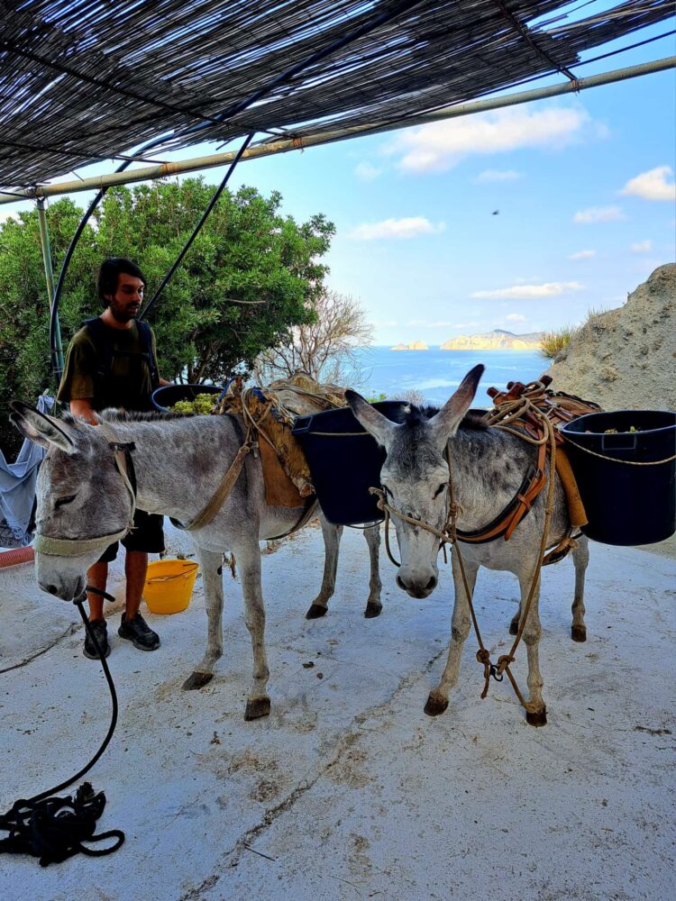 La viticoltura a Ponza è eroica al 100%: ormai, si lavora in cantina con moderne tecniche enologiche. La vita della vigna è invece eroica in ogni suo momento: potature, diradamenti, sino alla vendemmia, completamente manuale e a dorso d’asino. Sì, avete capito bene: l’unico modo per trasportare l’uva in cantina è con gli asini e ogni viaggio costa 35,00 €. Ditelo a quelli che si lamentano se una bottiglia di Fieno Bianco costa in enoteca tra i 30,00 e i 40,00 €. “Molti terreni sono stati abbandonati, i proprietari me li propongono per l’acquisto – mi racconta Emanuele – e, francamente qualche trattativa interessante c’è. Non posso però, fare a meno di pensare a chi si occuperà di tutto questo, noi ci stiamo facendo vecchi… il mio desiderio più grande è salvare il Fieno, e soprattutto che Ponza possa riscoprire quella vocazione agricola che aveva e che ha sacrificato in nome del turismo.”