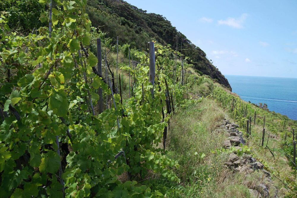 …All’inizio degli anni 2000, a distanza di quasi 50 anni e superati i 60, Emanuele getta il cuore oltre l’ostacolo e decide, con l’aiuto di alcuni contadini ponzesi, Liberato, Luigino e Giustino Mazzella (tipico cognome ischitano), di “zio Aniello”, antichi vignaioli che parlavano alle viti e davano da mangiare ai pettirossi, di voler ripristinare i vigneti a Punta Fieno. Nasce così Antiche Cantine Migliaccio. Il lavoro da fare era tantissimo: ricostruire i muretti a secco crollati, sistemare i terrazzamenti, recuperare le vecchie viti a piede franco e, con il sistema della “magliola” (propaggine o, nei Campi Flegrei, calatoia), piantare dove c’erano fallanze. Una fatica incredibile che però rende felici Emanuele, Liberato e Luciana.