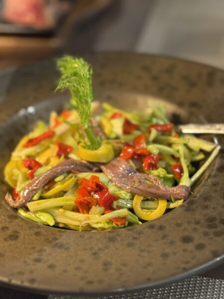 Esistono ristoranti che provano a cambiare pelle ogni stagione. E poi ci sono quelli che, migliorando poco alla volta, arrivano a diventare delle certezze. Antiche Mura Grill&Wine è uno di questi. Ci troviamo a Paestum, davvero a ridosso delle mura, costeggiando gli scavi. Giovanni Monzo – già proprietario (insieme alla famiglia) del noto Bar Anna fronte templi – lo ha costruito negli anni, con costanza e senza inseguire mode. Ne Sala esterna ben riscaldata, due sale interne di cui una nel soppalco, nella cantina. Ti siedi e capisci subito che qui si viene per stare bene.