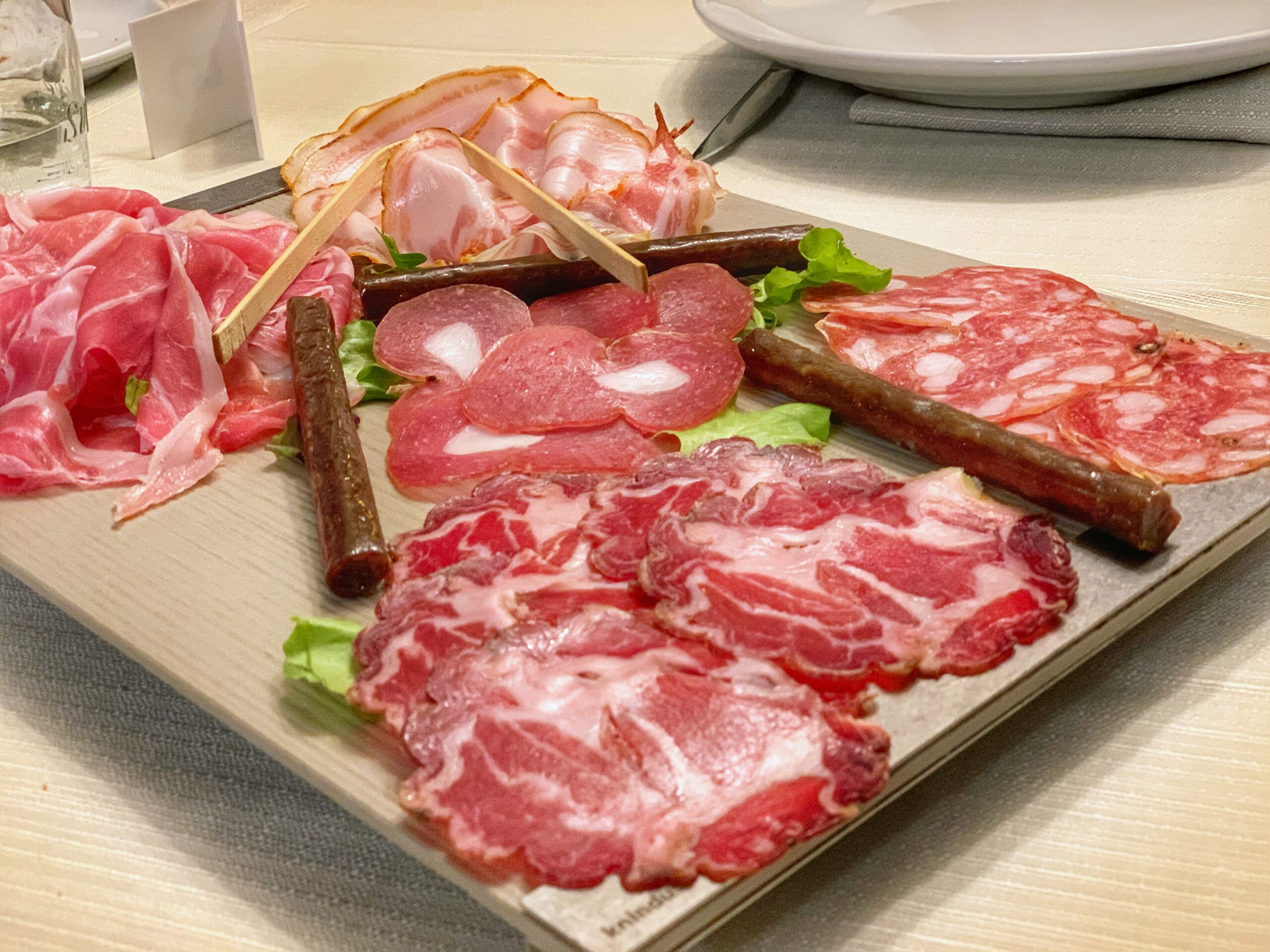 Nonostante sia un ristorante di terra, da Antiche Mura c’è una selezione di alcuni piatti a base di pesce. Entrando, poi, c’è un dettaglio che racconta bene il posto: il banco dei formaggi. Non è lì per scena, è parte del percorso.