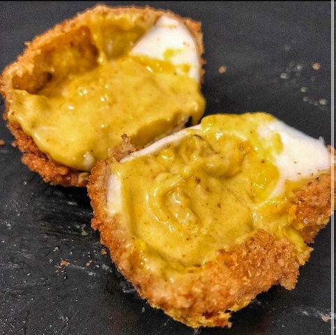 Ha personalità e gusto anche la rivisitazione dell’uovo alla monachina di Renato Ruggiero della Pizzeria Carlo Sammarco 2.0, che ha puntato sull’uso di diversi formaggi per rendere questo piatto tradizionale della cucina napoletana ancora più cremoso. Le uova alla monachina risalgono ai tempi del Re Ferdinando IV di Borbone: il sovrano è rimasto colpito dal piatto preparato da alcune monache, che usavano passare le uova sode nella farina, nell’uovo sbattuto e nel pangrattato prima di friggerle e di donarle ai poveri. Dopo aver assaggiato questo fritto, il re ha chiesto ai suoi chef francesi (i Monzù, da “monsieur”e cioè signore) di riprodurre il piatto, a cui i Monzù hanno poi aggiunto la besciamella. Nelle due pizzerie di Carlo Sammarco l’uovo alla monachina viene proposto con l’uovo sodo, mischiato alla besciamella e ad altri formaggi: una deliziosa salsa che crea un interessante contrasto con il croccante della panatura.