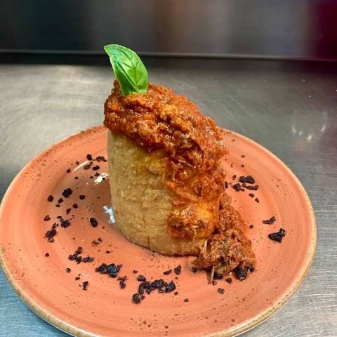 È un gustoso fuori menu e un ricco omaggio alla tradizione italiana: il cannellone ripieno e fritto di Marco Rufini si chiama Bambolo. Viene preparato con pasta all’uovo fatta in casa, ripieno di manzo, maiale, vitello, fior di latte tipo Agerola, pomodoro Gustarosso e successivamente panato con pane realizzato dallo stesso pizzaiolo e chef, accompagnato da una salsa rosa con besciamella al parmigiano. Una proposta difficile da dimenticare.