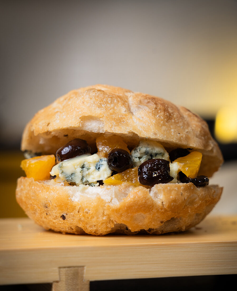 Rendere il pane croccante al forno e tagliarlo a metà orizzontalmente. Adagiare alla base l’arancia e continuare con il blu di bufala, le olive caramellate e la cremina che si è formata durante la cottura di queste ultime. Terminare con la fonduta di cioccolato bianco, versandola su tutta la superficie.