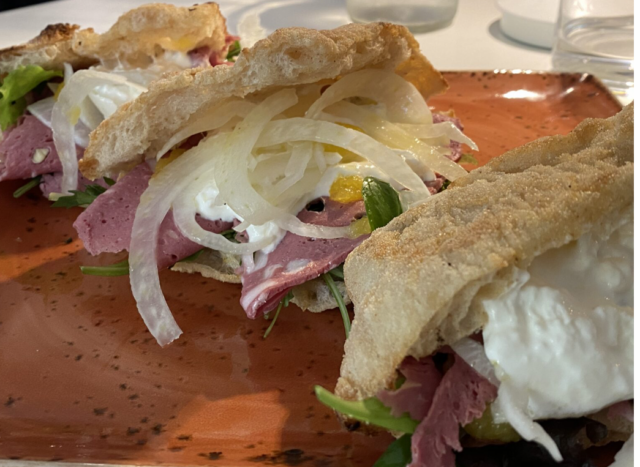 Genovese doc: doppia cottura in padellino. Carne marchigiana, crema di provola di Agerola,chips di pecorino romano dop.