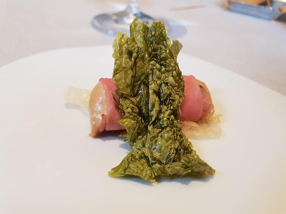 - La cucina. La tecnica è fondamentale in cucina, ma deve essere uno strumento per migliorare la piacevolezza del piatto. Antonino ha ben presente questo “dogma”. La sua cucina, piena di spunti ha sempre presente la golosità e la godibilità. La Suprema di piccione è veramente fantastica, cotture diverse per le varie parti del piccione, tutte millimetriche. La riduzione di vino, l’evidente nota tostata e leggermente amara del cacao sull’avvolgente corpulenza del fegato grasso, due foglie di spinacio per una sensazione vegetale da centellinare. Meraviglia. Oltre a confermare la mia convinzione che il cuoco bravo è quello che ti fa mangiare anche le cose che non sono proprio nelle tue corde, come la tartare di mozzarella, gamberi, puntarella e colatura di cime di rapa. Non amo l’abbinamento gamberi/mozzarella, in quasi tutti i piatti provati nella mia vita da gourmet praticante l’ho trovato quasi sempre trascurabile, invece in questo caso è stato il piatto del “viaggio”.
