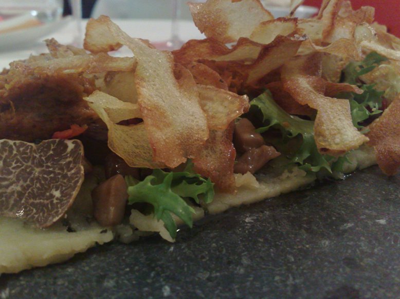 Piatto lavico, tappeto di patate in purea, porcini, tartufi, scarole.