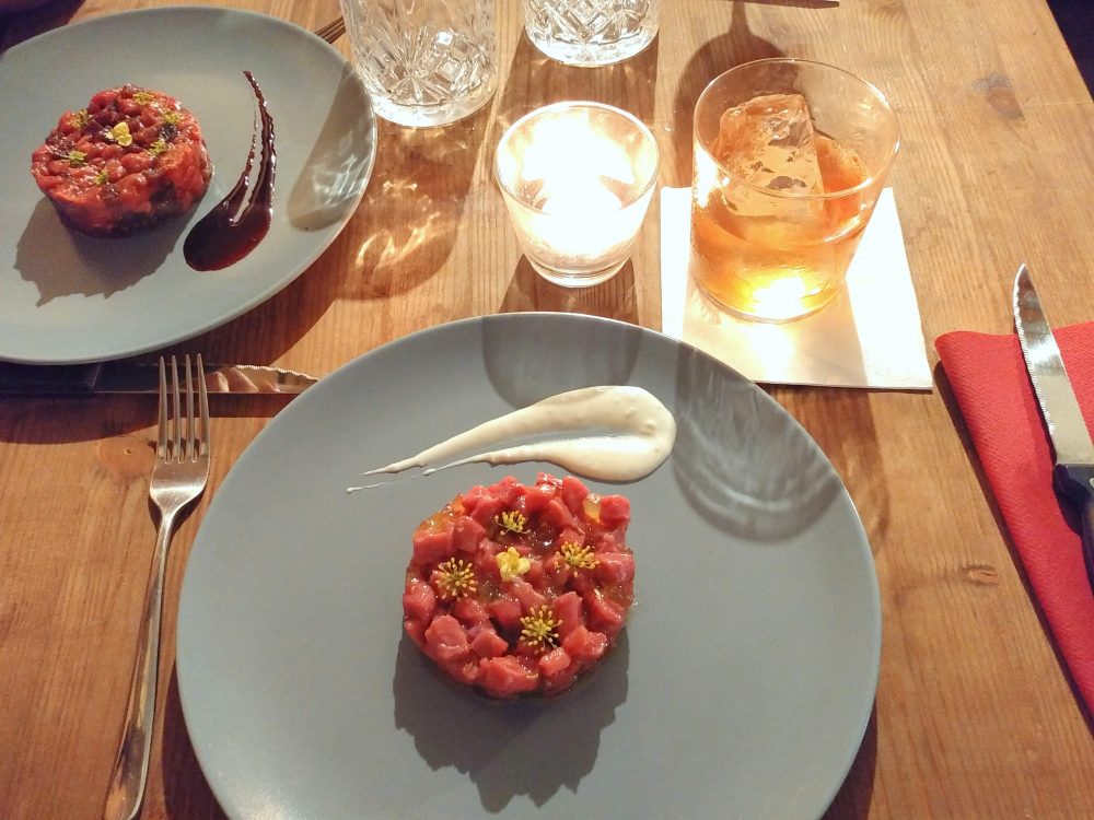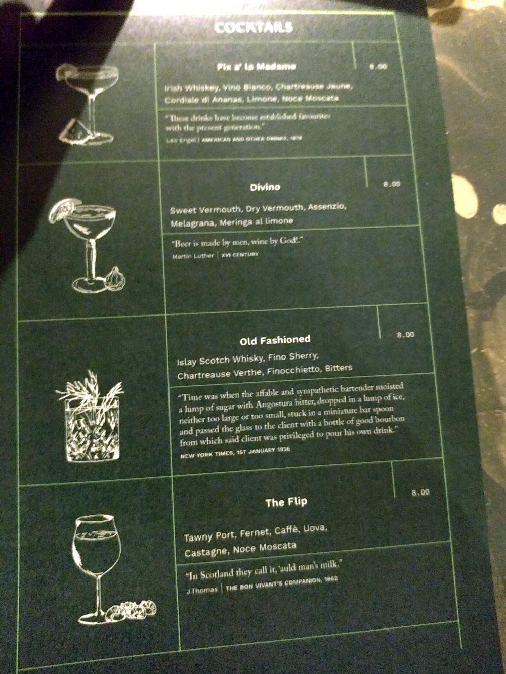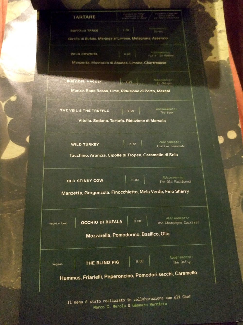Nella sera della visita, è stato provato l’abbinamento tra una Old Stinky Cow (carne di manzetta, gorgonzola, finocchietto, mela verde e Sherry fino) e un Old Fashioned (Whisky d’Islay, Sherry fino, Chartreuse verde, finocchietto e bitter). Perfetto nella sua stabilità, l’equilibrio complessivo: il finocchietto solletica il palato, la mela verde lo rinfresca; l’intensità del gorgonzola si lega allo Sherry e ammanta con giusta misura il boccone. Il cocktail, di buona fattura, riprende alcuni temi della tartare e ripulisce la bocca.
