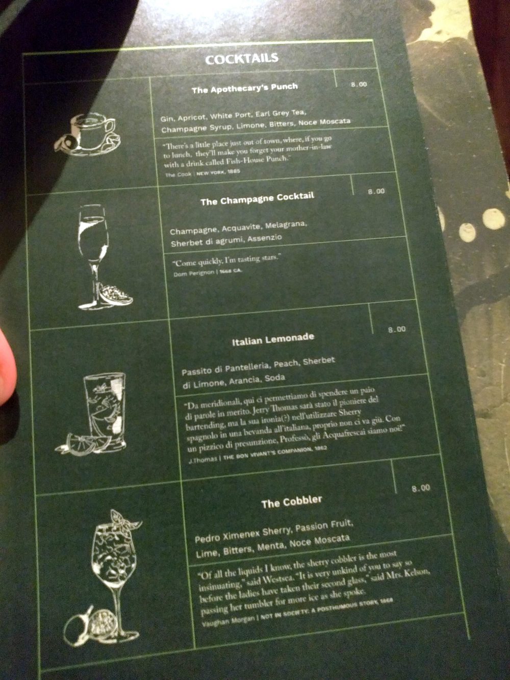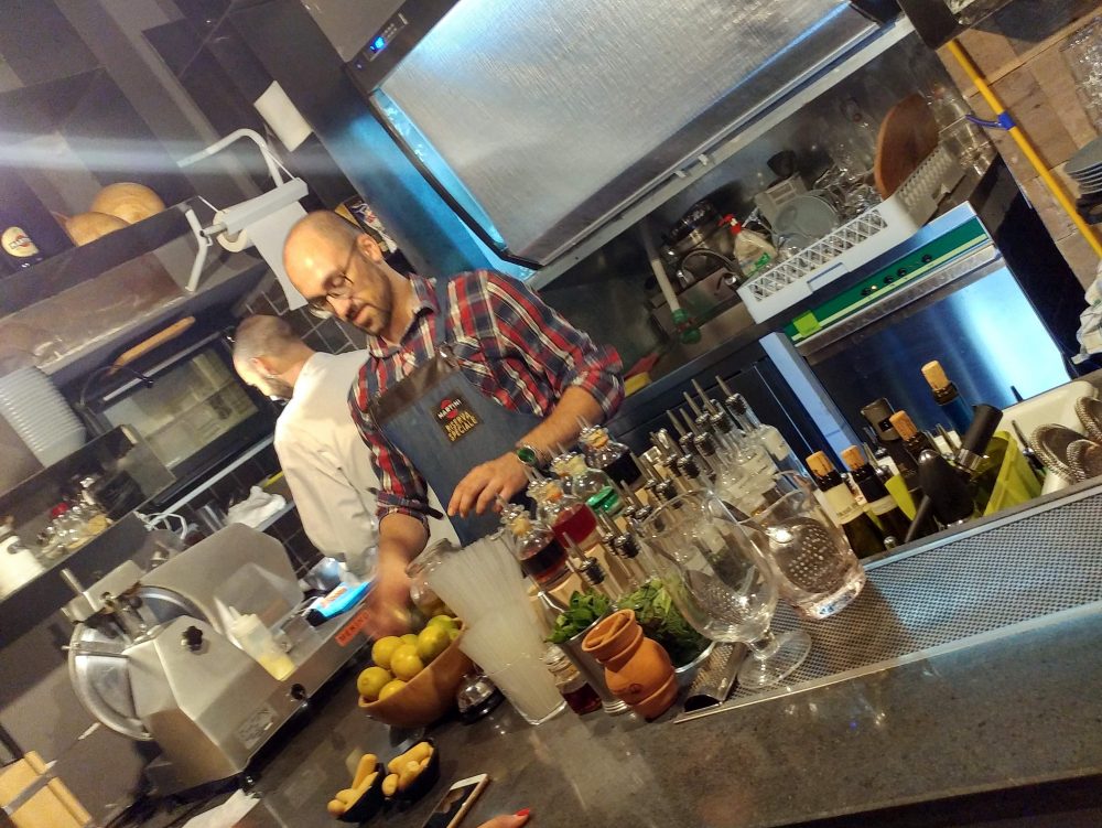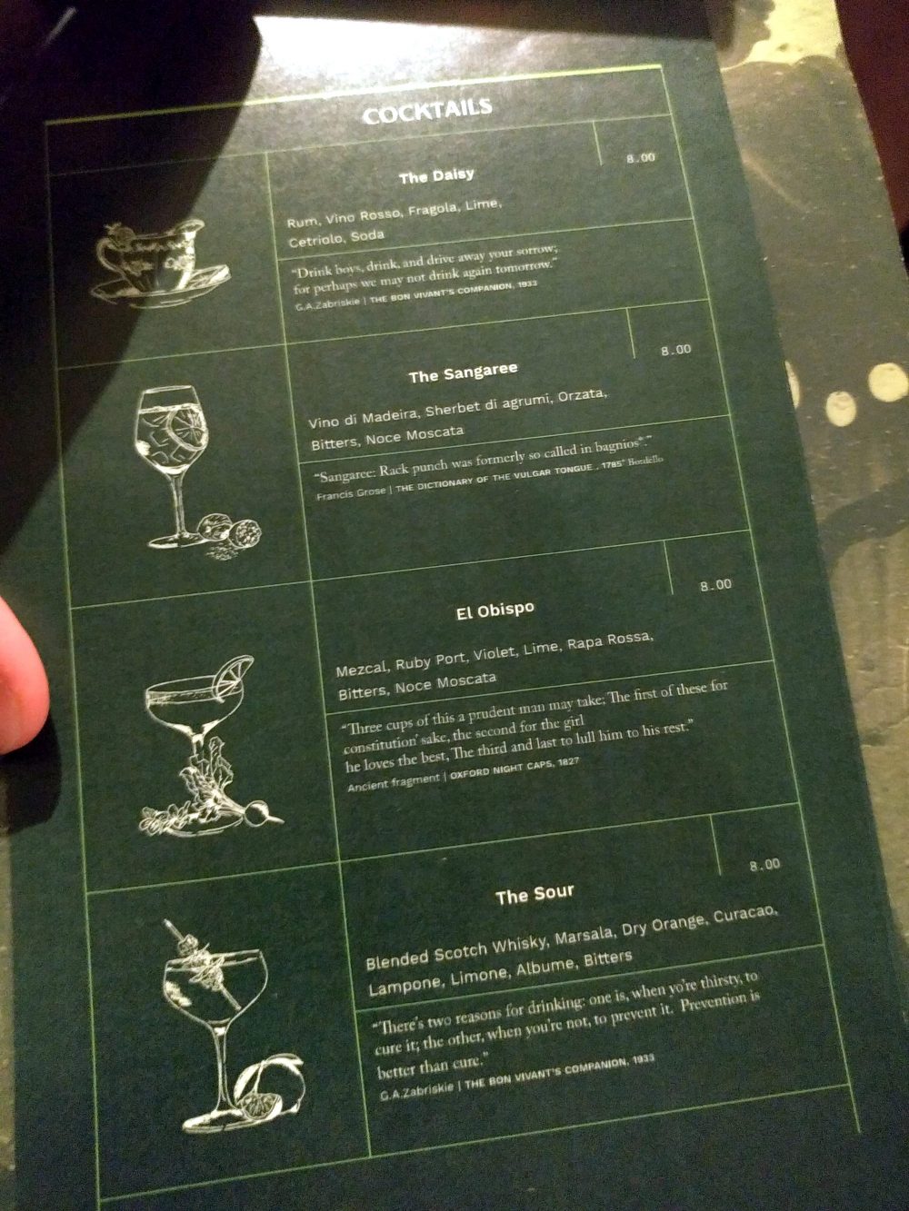 Nella sera della visita, è stato provato l’abbinamento tra una Old Stinky Cow (carne di manzetta, gorgonzola, finocchietto, mela verde e Sherry fino) e un Old Fashioned (Whisky d’Islay, Sherry fino, Chartreuse verde, finocchietto e bitter). Perfetto nella sua stabilità, l’equilibrio complessivo: il finocchietto solletica il palato, la mela verde lo rinfresca; l’intensità del gorgonzola si lega allo Sherry e ammanta con giusta misura il boccone. Il cocktail, di buona fattura, riprende alcuni temi della tartare e ripulisce la bocca.
