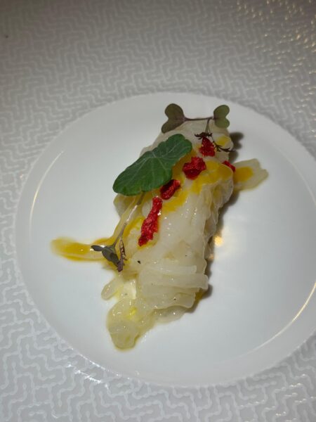 Si inizia con la caprese di mare di Feo, essenziale, luminosa, e l’alice fritta ripiena di Manisera, golosa e sincera. Poi le “tagliatelle” di calamaro pescato all’amo con gel di frutto della passione e lampone disidratato, il tortello ripieno di ricotta di bufala, alici di menaica e broccoli, e quella cernia con bouillabaisse che sa di porto e di memoria. In chiusura, i dolci di Feo – l’“oliva” che riapre i sensi, il Bosco Incantato – confermano che qui la cucina è pensiero, non intrattenimento.