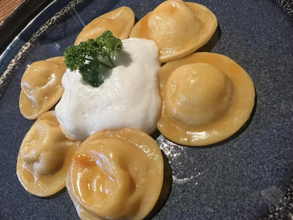 Arca Restaurant Raviolo, gambero rosso e spuma di mozzarella