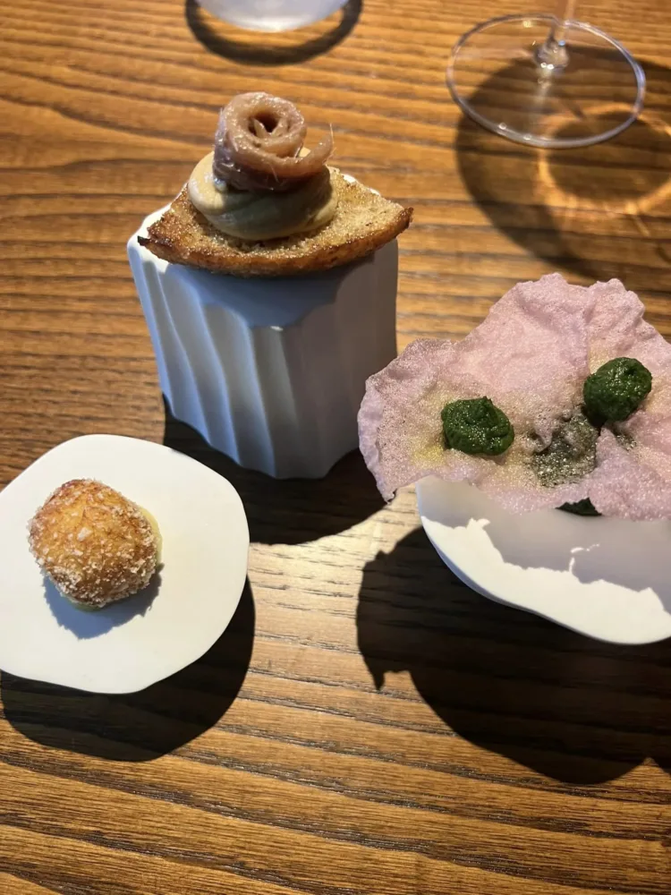 Arca Restaurant: il benvenuto Chips di riso e carota viola con friarielli; bruschetta burro di anacardi e alice; pallina di baccalà mantecato.
