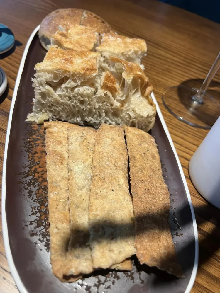 Una cena formale che parte con un benvenuto Chips di riso e carota viola con friarielli; bruschetta burro di anacardi e alice; pallina di baccalà mantecato.