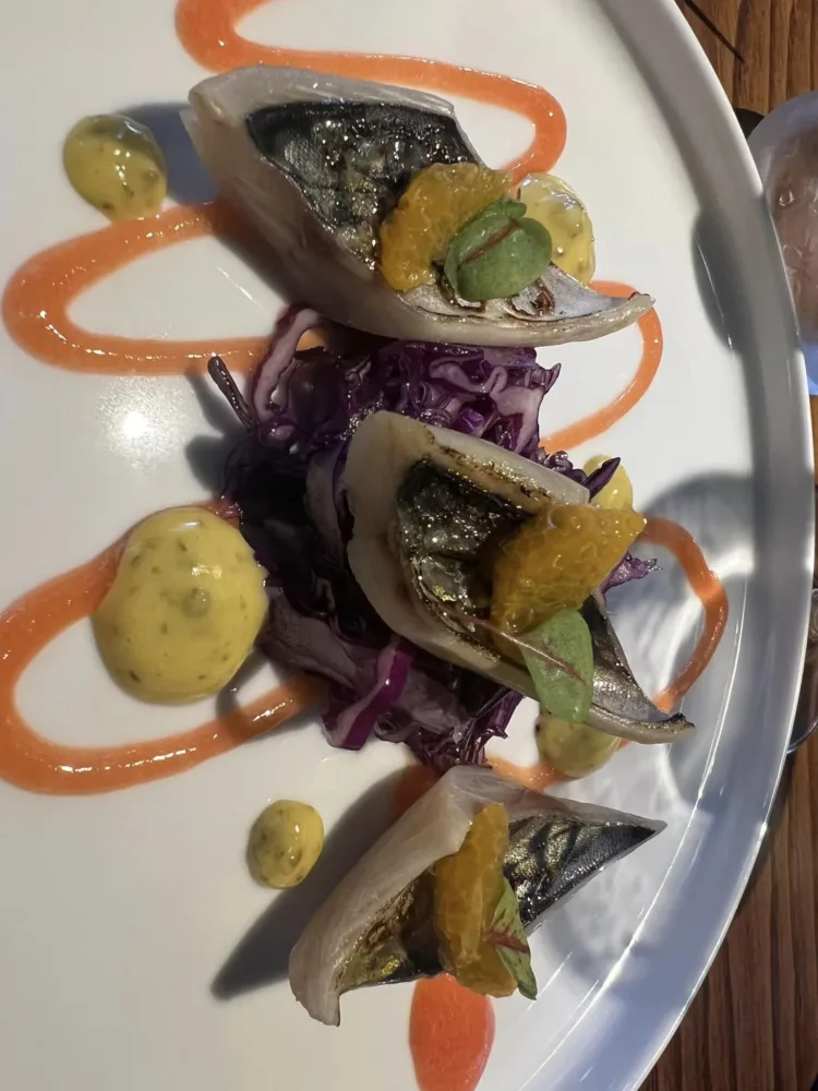 Arca Restaurant Sgombro marinato, agrumi, cavolo cappuccio viola e mayo ai capperiSgombro marinato, agrumi, cavolo cappuccio viola e mayo ai capperi