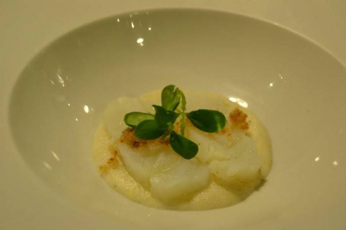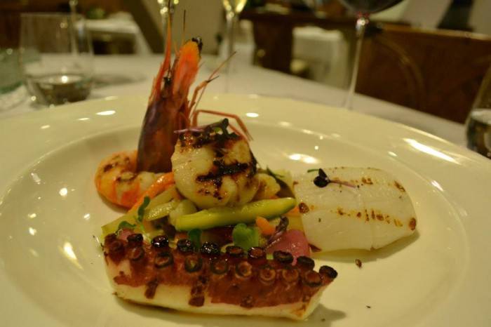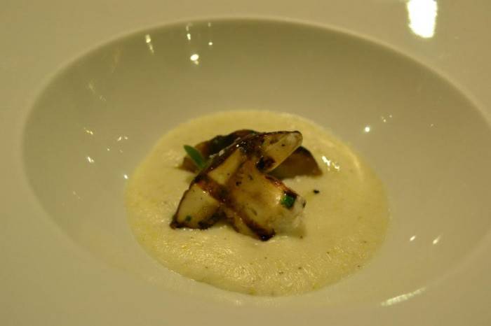 Antipasto: il calamaro, il polpo e la cappasanta arrostiti, verdura d' inverno, olio alla vaniglia e pepe Sechuan