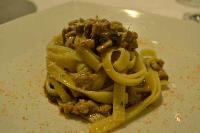 Fettuccelle al ragù di agnello, fonduta di cipolla di Tropea, caciotta di Manciano e polvere di peperoni