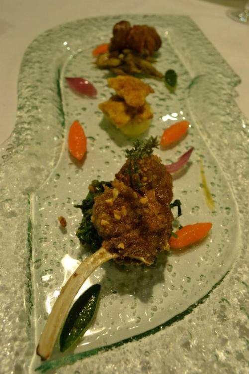 Variazione di agnello, la braciola di spalla al tartufo, l'animella croccante al mais, la costoletta al pane speziato e pinoli
