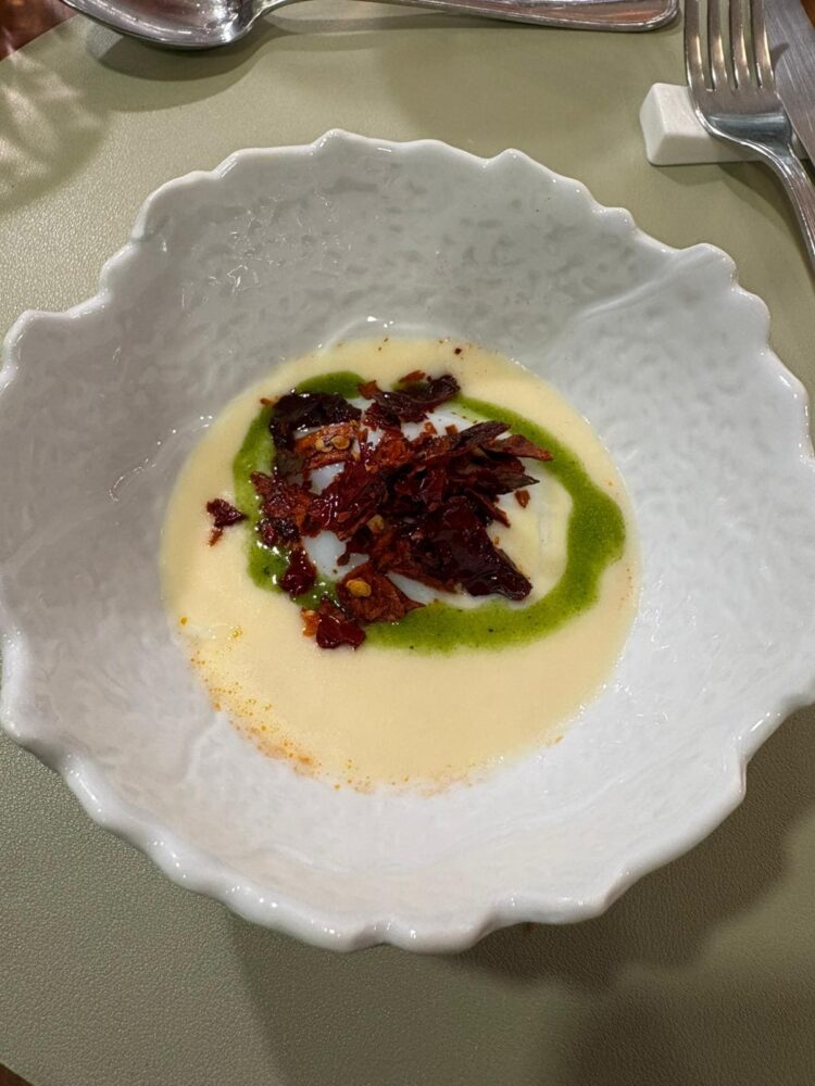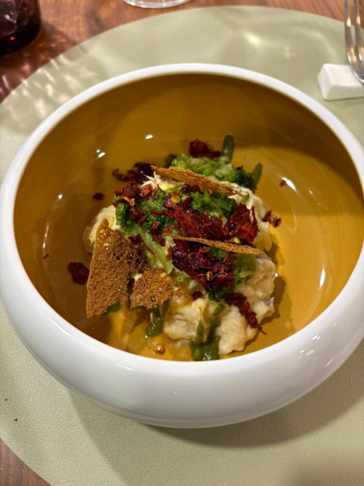 L’uovo in purgatorio con pomodoro della Valle dell’Ufita, parmigiano e peperone crusco è un rimando ai profumi delle domeniche a casa, così come il brodo di cardone rivisitato con piccoli ravioli ripieni di cappone.