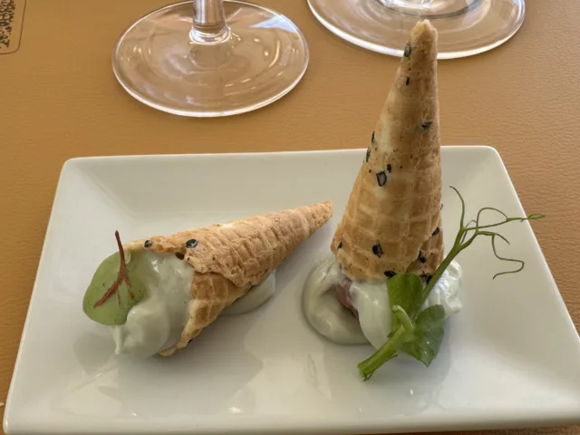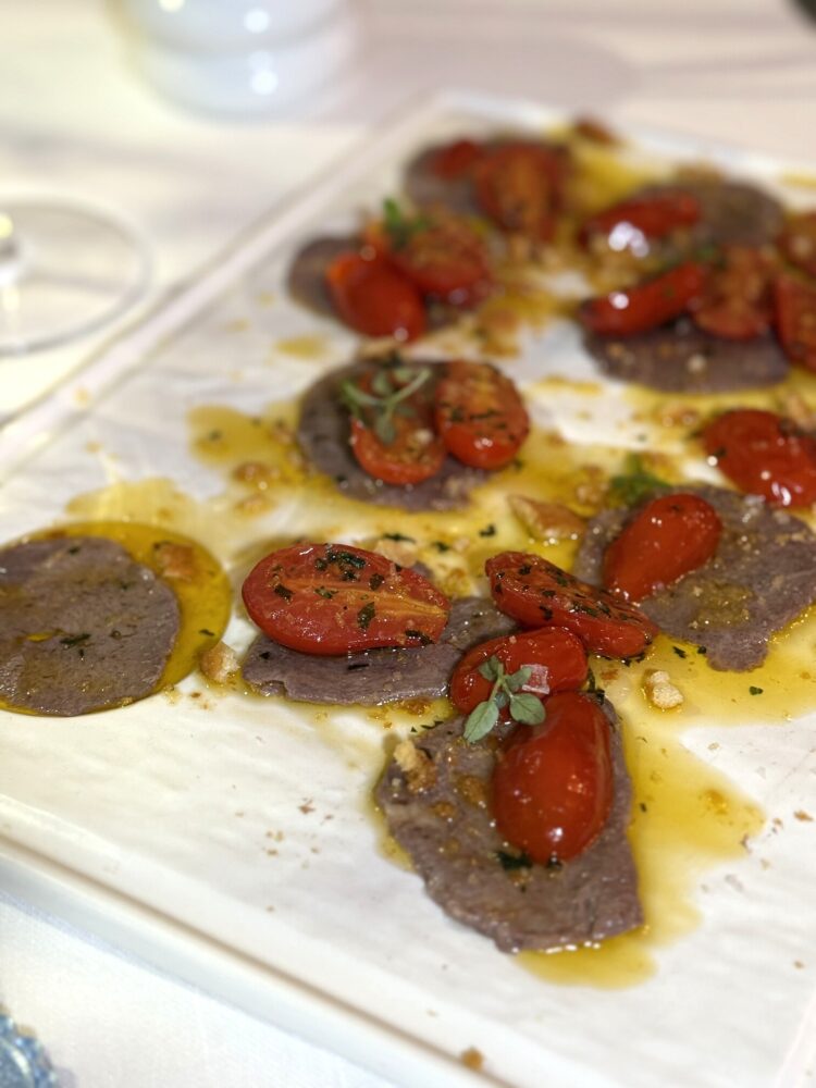 Partiamo dagli antipasti e qui il sommelier propone il Visio Rosé di Cruna di Subida, fresco e luminoso, ideale per accompagnare i sapori iniziali. Il carpaccio di manzo tiepido colpisce per l’equilibrio tra acidità e dolcezza, con il pomodoro appena scottato che avvolge la carne in modo pulito e preciso.